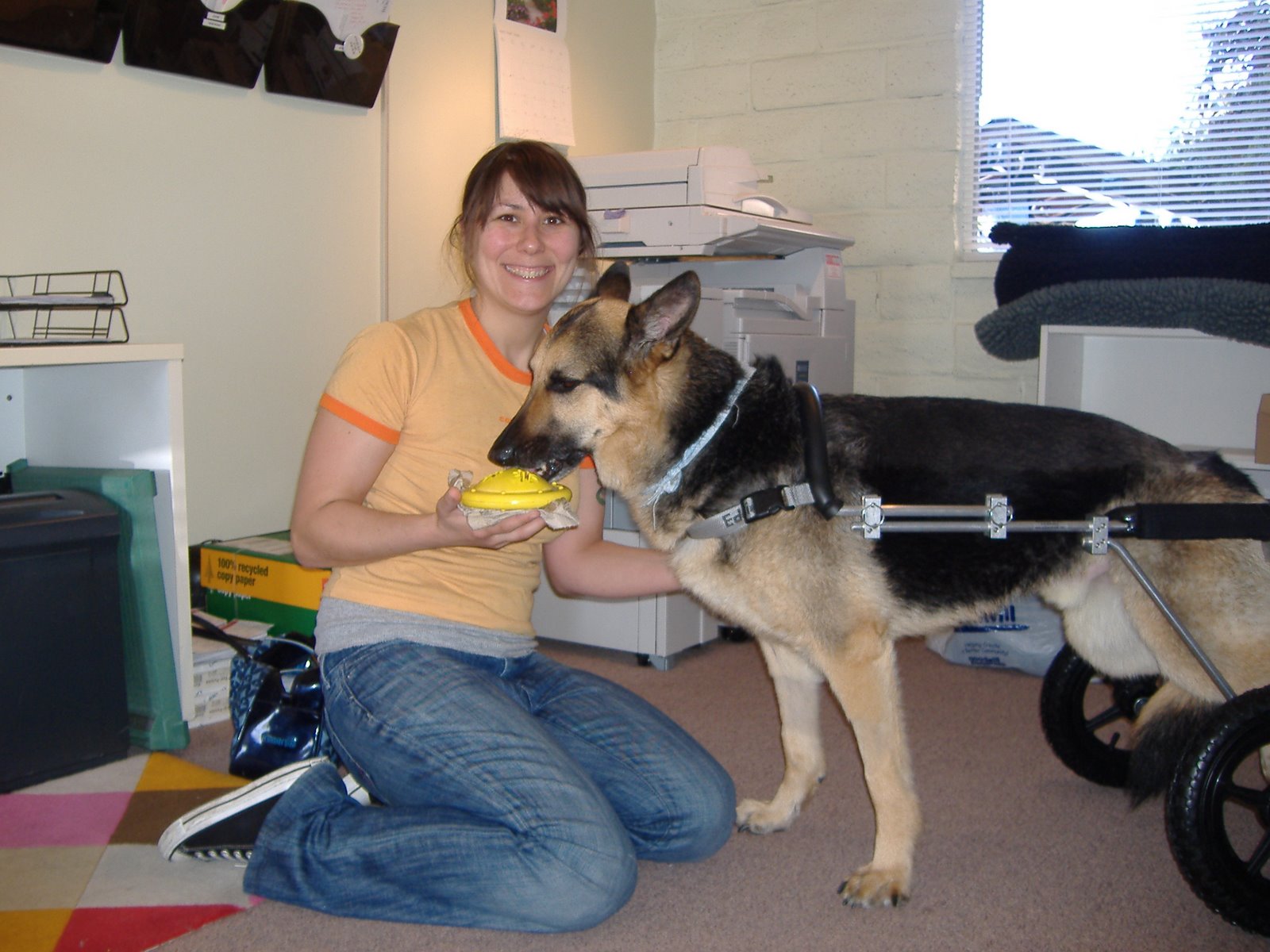 To get to the raison d’être of this blog, Ali is doing really well and has settled nicely at our new place in Petaluma. He is using the ramp successfully and the park across the street is very convenient for us. I take him there 3 times a day (2 on work days) to exercise, go potty, and do ten minutes of standing exercises in his cart. He and Rita, Maggie’s dog, are getting along great and I couldn’t ask for a better canine roommate for him right now. She is pretty low key which is good, because he wanted to play immediately when he met her, and when Ali plays he throws his whole body into and even likes to spin around (his infamous “play spins”), so I had to watch him pretty carefully to make sure he did not overexert himself. It has been interesting adjusting to life outside of one room, because of course he sometimes wants to travel from room to room, or greet Maggie and Rita when they come home, and meet new people when they come over. I have to watch him so he does not drag himself, which he definitely was trying to do a lot at first (and still does sometimes) and when he wants to get up I run over and grab him by his Walkabout rear harness (aka his “shepherd handles”), which I leave on him all day until we go to bed, and assist him by lifting his rear legs so he can walk where he wants using his front. The rest of the time he is on one of his beds. Getting to and from work has been a challenge (obviously compared to the convenience of living in my office, ho, ho, ho). Everything takes so much longer, getting him in and out of the car is kind of tricky (and making sure he doesn’t get himself into some weird position while I am driving), but we are getting into the new routine. Last week we were able to join in our first staff dog walk since his surgery over two months ago, which was great. The other dogs were not quite sure what to make of his wheelchair at first, but it didn’t stop Alec from his favorite activity while walking with a group dogs – trying to pull to the head of the pack so he can be the first one in what must appear to onlookers like a dog parade.