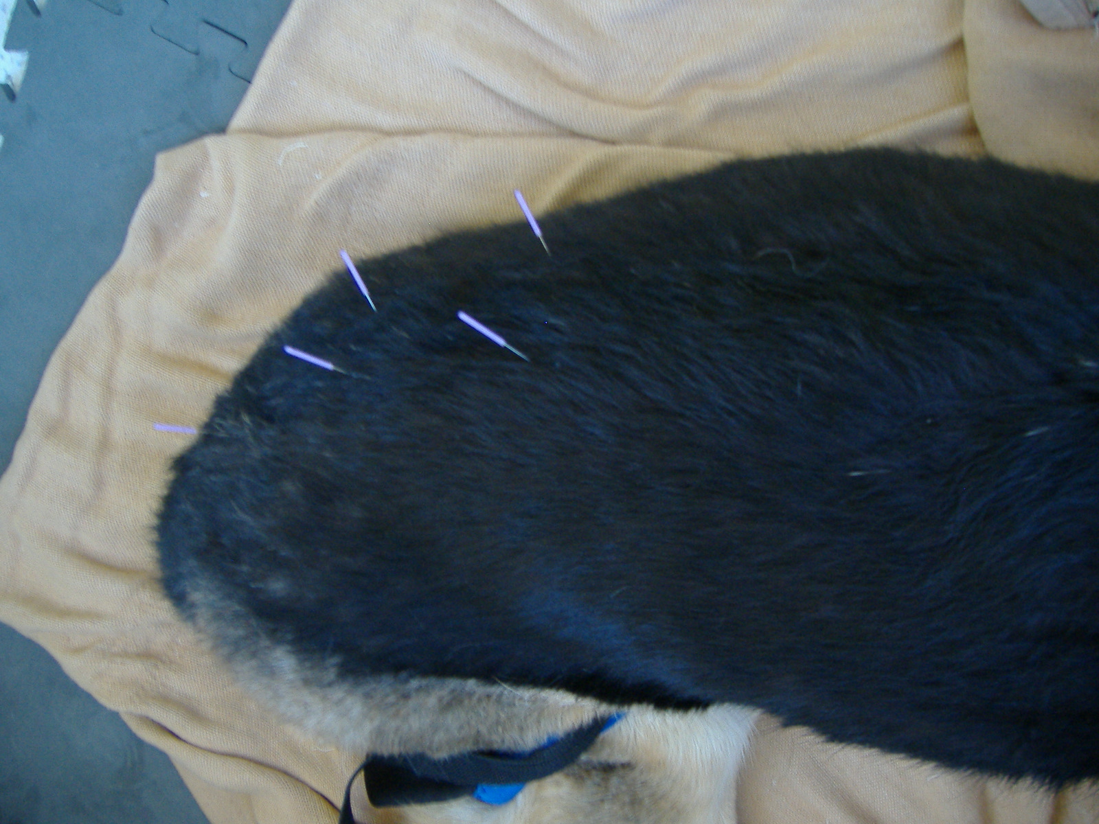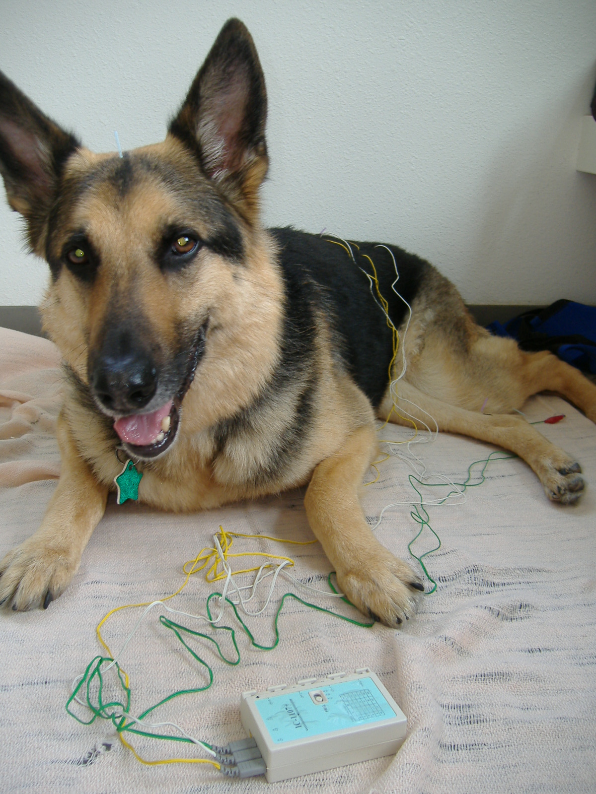 Ali had his fourth acupuncture treatment last week. Starting with the second time, Dr. Canon hooked his needles up to a little box of wires that transmit electricity (see photo). He looked like such a Frankenpuppy hooked up to those wires! The gauge on the electric box goes up to 4, which she said most dogs can handle, but once we reached 2 Ali’s hind legs sort of twitched and he sat straight up, indicating he felt something, even at that relatively low dose. So she let him “pickle” at number 2 for 20 or so minutes. The fact that he reacted to such a low dose of electricity suggests he may be more susceptible to the therapeutic aspects of the acupuncture so I think his “sensitivity” in this regard is actually a good sign. The last two weeks he was able to handle her turning it up to 4 (I could actually feel the current pumping through his muscles – they kind of pulsate – it was weird!).