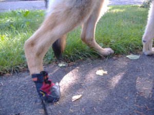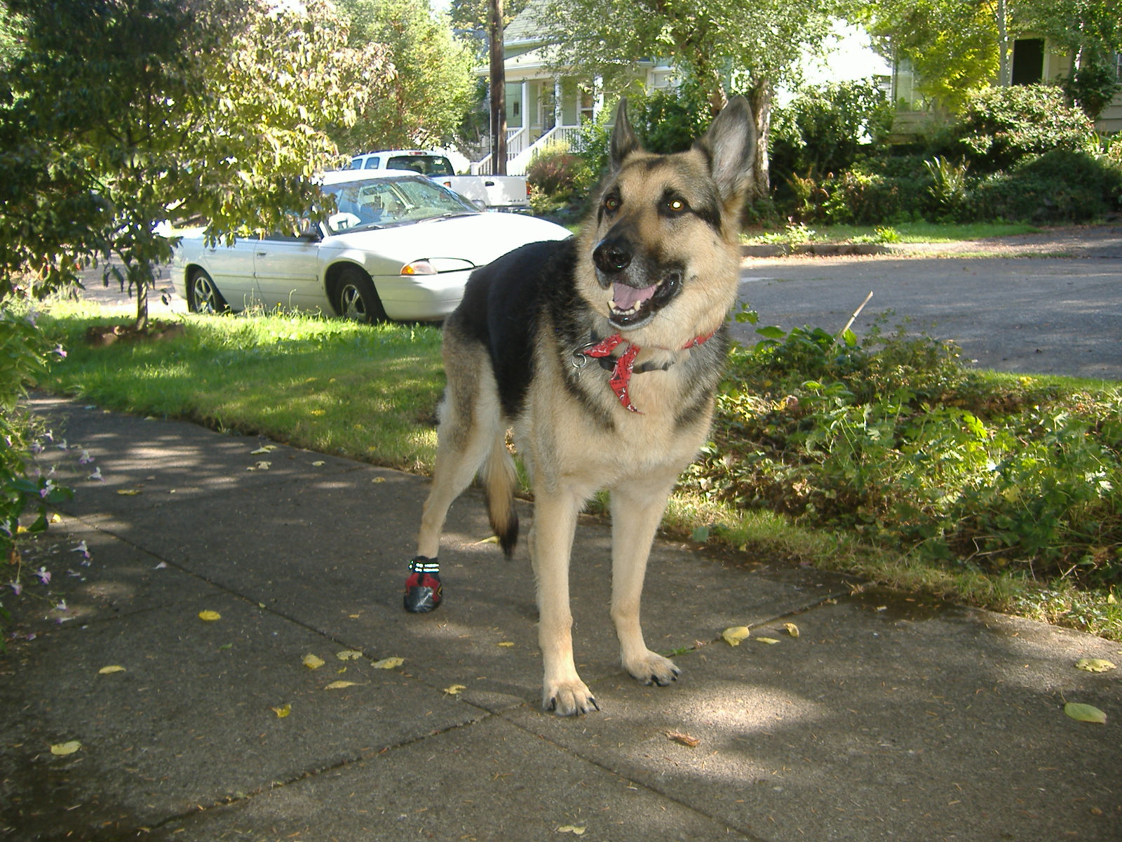 I am ecstatic to report that Alec has not used his doggie wheelchair since June!! He is walking without assistance for up to 1/2 hour walks a few times a day. He has a pronounced limp and needs to wear a shoe to keep him from damaging his paw when we walk outside (his right hind leg will probably never be completely “normal,” but his left leg is pretty much 100%) and because he drags his back toes, the fabric of the shoe wears through really quickly. The shoe is not cheap ($60 for one!), but duct tape can do wonders to keep things from falling apart, so each day I put a new layer of tape over the toes and it seems to be working pretty well. Luckily, a client of his physical therapist donated a couple of these shoes to the rehab center and she in turn donated them to me and Alec, so I am trying to make them last as long as possible. He has not had any toe scrapes or paw issues in some time (knocking furiously on wood!!); that was a recurring problem for awhile and a source of constant worry and stress. But the shoe seems to be working really well to protect his foot and he gets around so well it is just incredible. Recently when I was walking Ali back to the car after one of our river swims (sans shoe – he doesn’t need to wear it on the grass or sand), a gentleman remarked with concern, “I think your dog might have a rock stuck in her paw. She seems to be limping.” I replied, “Actually he was paralyzed not long ago, and is learning to walk again” and I realized, wow – if he can be mistaken for a dog that has nothing wrong with him other than a rock stuck in his paw, he is walking pretty well!!