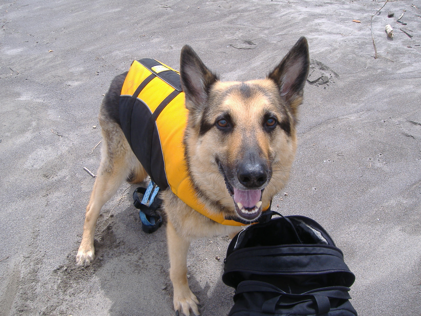 Waiting for me to take his floaty rubber ball out of the backpack so he can hit the water. Sauvie Island, July 23, 2009.