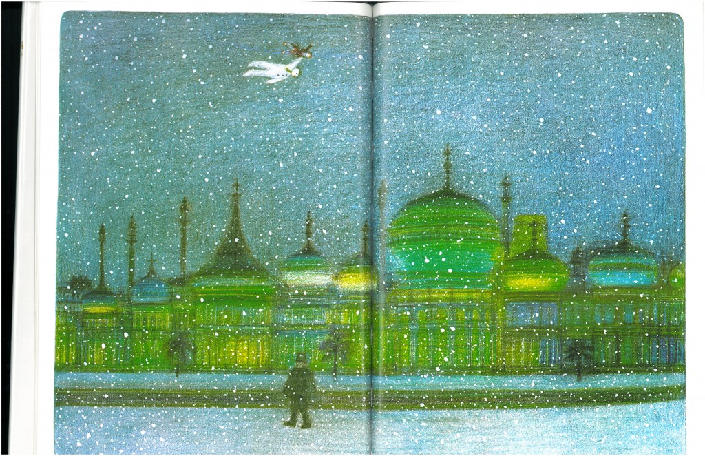 The phrase “nothing gold can stay” popped into my mind, however, not as I was thinking of Ponyboy Curtis but of snowmen, and how they always melt. My good friend Blaine recently made me aware of a poignant (and apparently classic) children’s book that perhaps everyone in the world has heard of but me, Raymond Briggs’ The Snowman. Although Blaine warned me that as with most tales involving snowmen this one did not end happily, I have an affinity for snowmen (especially ones that come to life and stuff) and had to check it out. So check it out I did, after briefly waiting for someone to return it to my local branch of the public library. Clutching it in my hands eagerly (the cover was so cute!) I raced back to my office where I “read” it less than ten minutes (scare quotes because one does not read The Snowman; it is a picture book and WOW are the illustrations gorgeous). I can’t believe I never heard of this book! Thematically it is similar to The Velveteen Rabbit, another of my all-time favorite stories. In a nutshell, boy builds snowman, snowman comes to life, boy has magical night of adventure with snowman, boy hugs snowman goodnight, boy wakes up in the bright dawn of a new day to find snowman melted away, only a pile of clothes where he once stood. I started crying even as they were in the middle of their heart-melting magical adventure… maybe because I knew the terrible ending coming, or maybe because the illustrations of them flying hand in hand above the night cityscape were so breathtakingly beautiful, or maybe both. Either way, I had to close my office door because I was crying kind of loudly.